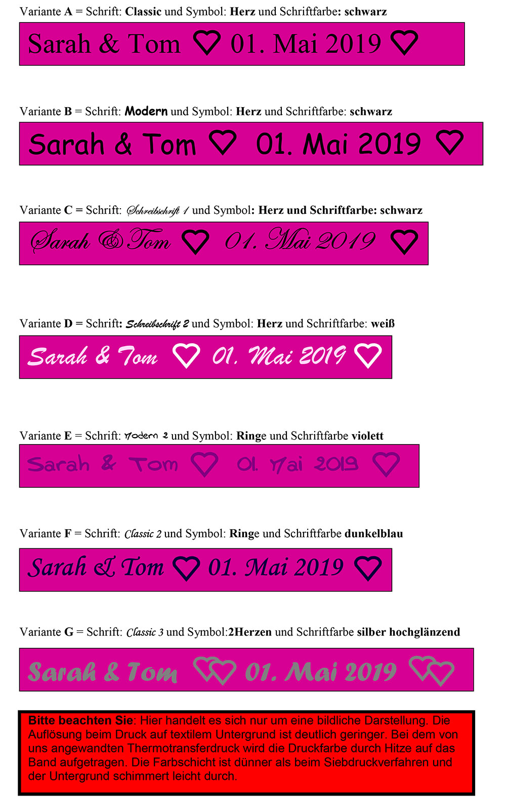 Dieser Artikel bietet Ihnen die Möglichkeit, Ihren persönlichen Textwunsch auf pinkes Satinband zu drucken. Wir verwenden ausschließlich doppelseitige Satinbänder der höchsten PREMIUM-Qualität. Sie haben die freie Wahl zwischen Motiv, Schriftart, Druckfarbe und Text.
