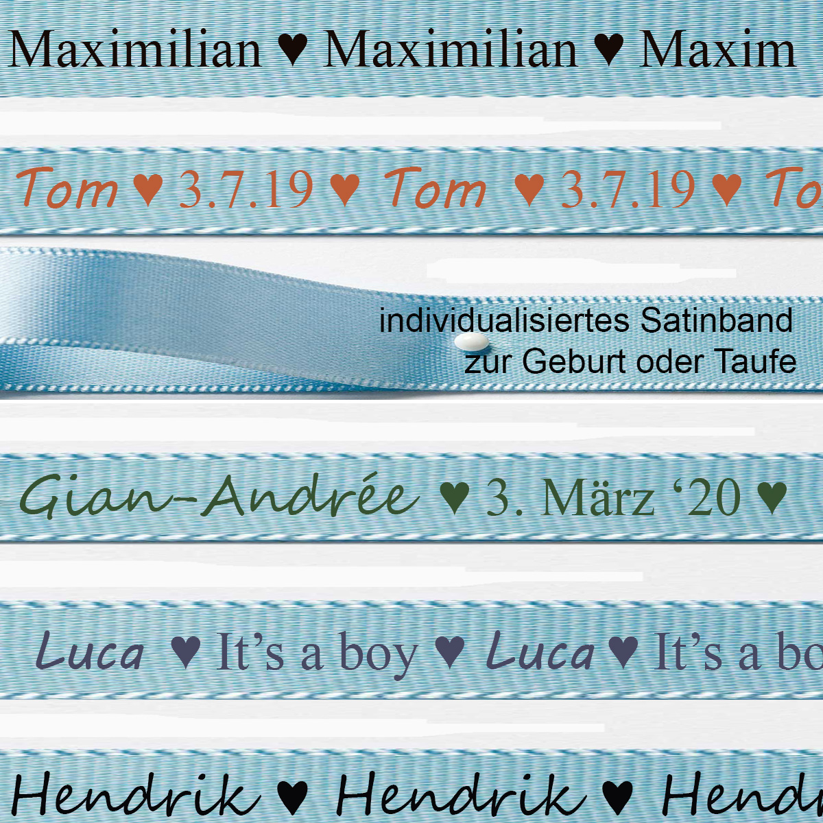 Individualisiertes Satinband zur Geburt und Taufe. Wir drucken den Namen und/oder das Geburtsdatum des Kindes auf Satinband hellblau in Ihrer Wunschfarbe: 15mm breit / 25m-Rolle