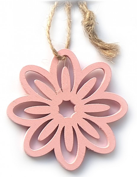 Dekorative Anhänger aus Naturholz mit Jutekordel zum Anhängen. Das rosa-farbige BLUMEN-Holz-Dekor hat eine Kreisrunde-Größe von ca. 5 cm x 5 cm. Die bereits eingefädelte Natur-farbige Jute-Kordel hat einen Durchmesser von 1,5 mm und ist ca. 7 cm lang. Diese Holz-Dekore werden im 5-Achs-CNC-Sägeverfahren produziert und sind dadurch sehr sauber verarbeitet. Auch die farbige matte Lackierung ist überall gleichmäßig deckend.