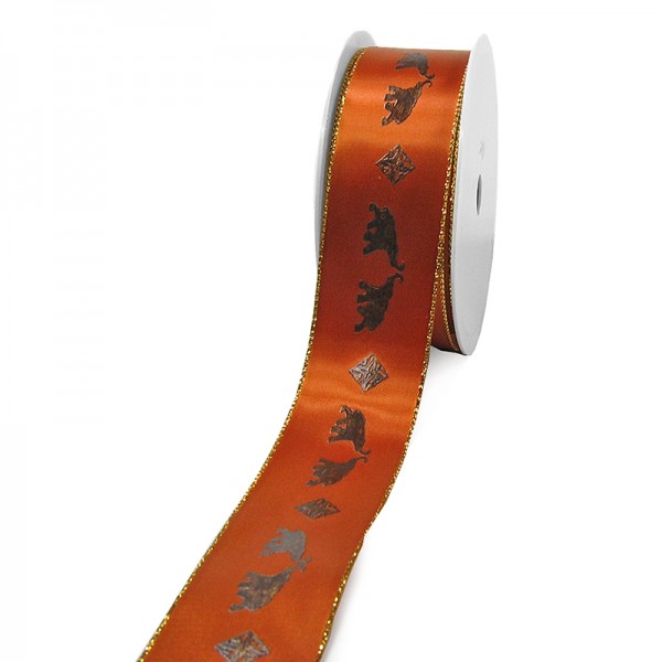 Dekorationsband "SAFARI": 40mm breit / 25m-Rolle. Das doppelseitige Satinband ist einseitig mit braun-farbigen Elefanten-Motiven bedruckt. Die goldene gewebte LUREX-Kante gibt mehr Stabilität beim Schleifenbinden. Das Material besteht zu 100% aus Polyester, hat einen feinen seidigen Glanz und einen fülligen Griff.