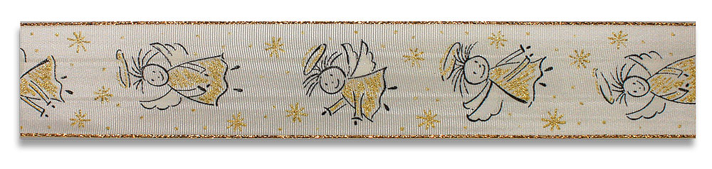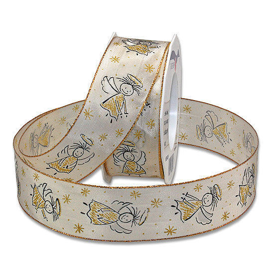 Weihnachtsband - HEAVEN: 40mm breit / 20m-Rolle, mit Draht- und Lurex-Goldkante. Dekorband aus Acetatseide = 100% Polyester. Die Druckmotive "Schutzengel" und die "Sterne" sind einseitig bedruckt. Die eingewebte Drahtkante verschafft mehr Gestaltungsmöglichkeiten. Das Material hat einen seidig schimmernden Glanz und einen fülligen Griff.